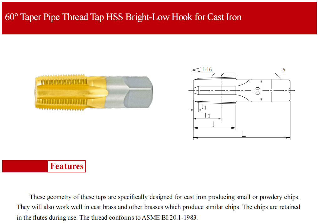 PRODUCT current location:Home > PRODUCT > 60° Taper Pipe Thread Tap HSS Bright-Low Hook for Cast Iron