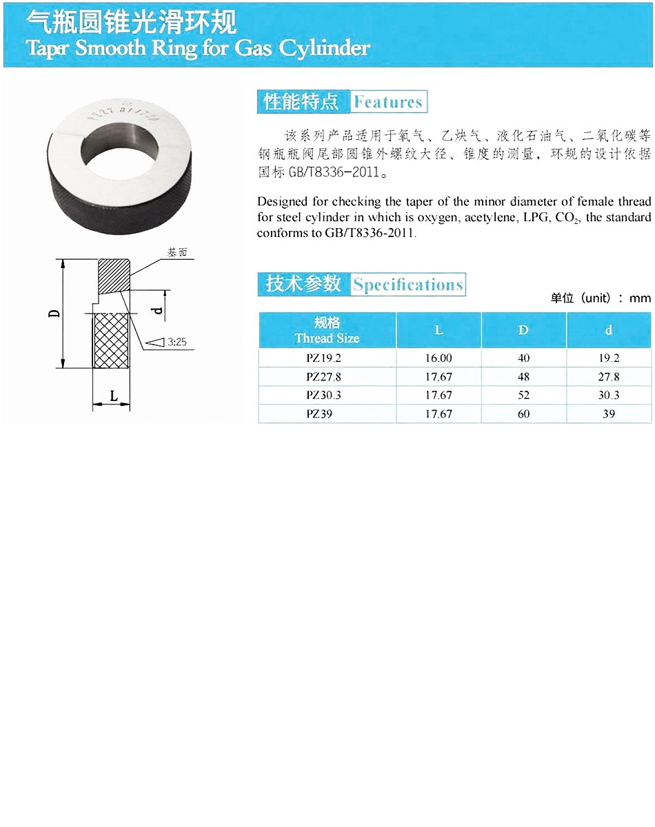 該系列產(chǎn)品適用于氧氣、乙炔氣、液化石油氣、二氧化碳等鋼瓶瓶閥尾部圓錐外螺紋中徑測量,環(huán)規(guī)的設計依據(jù)國標GB/T8336-2011。