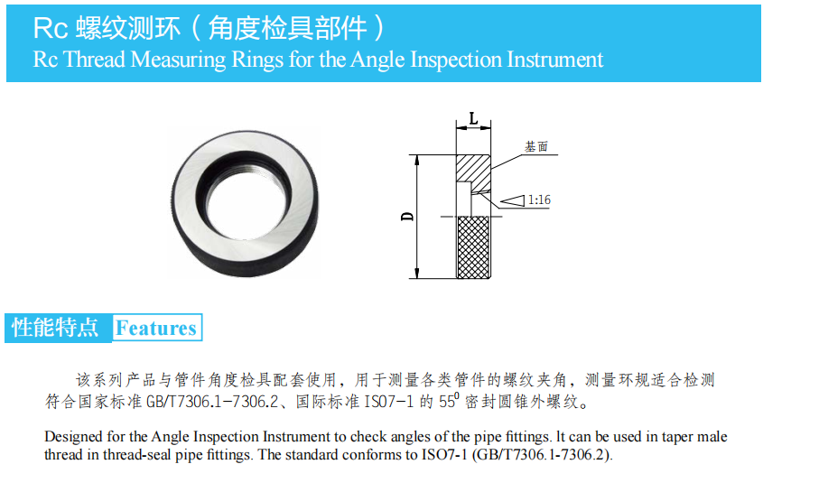 該系列產(chǎn)品與管件角度檢具配套使用,用于測(cè)量各類(lèi)管件的螺紋夾角,測(cè)量環(huán)規(guī)適合檢測(cè)符合國(guó)家標(biāo)準(zhǔn) GB/T7306.1-7306.2、國(guó)際標(biāo)準(zhǔn)IS07-1的 55'密封圓錐外螺紋。