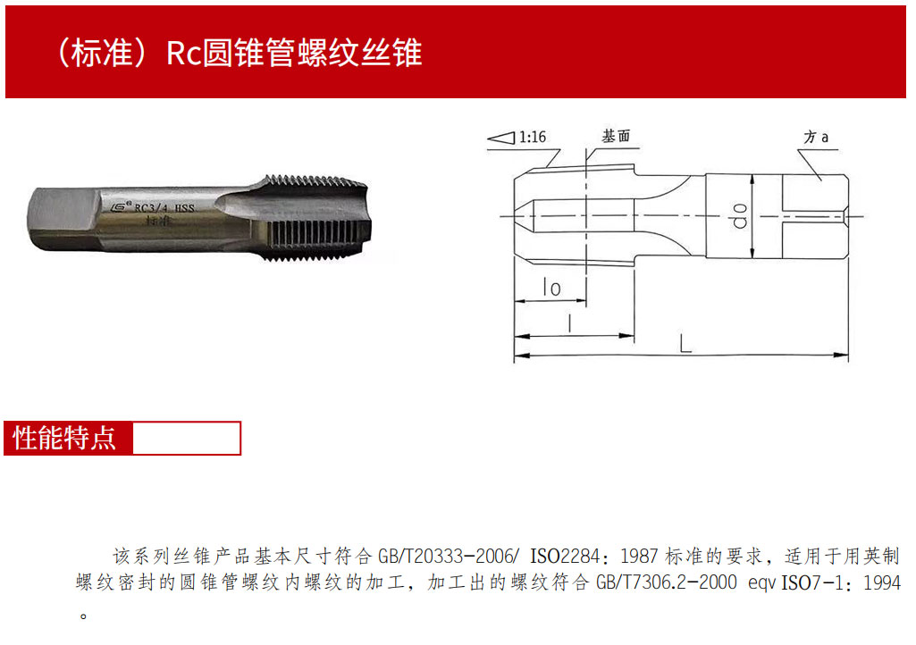 該系列絲錐產(chǎn)品基本尺寸符合 GB/T20333-2006/ IS02284:1987 標(biāo)準(zhǔn)的要求,適用于用英制螺紋密封的圓錐管螺紋內(nèi)螺紋的加工,加工的螺紋符合 GB7306.2-2000 eqv IS07-1:1994標(biāo)準(zhǔn)的要求。