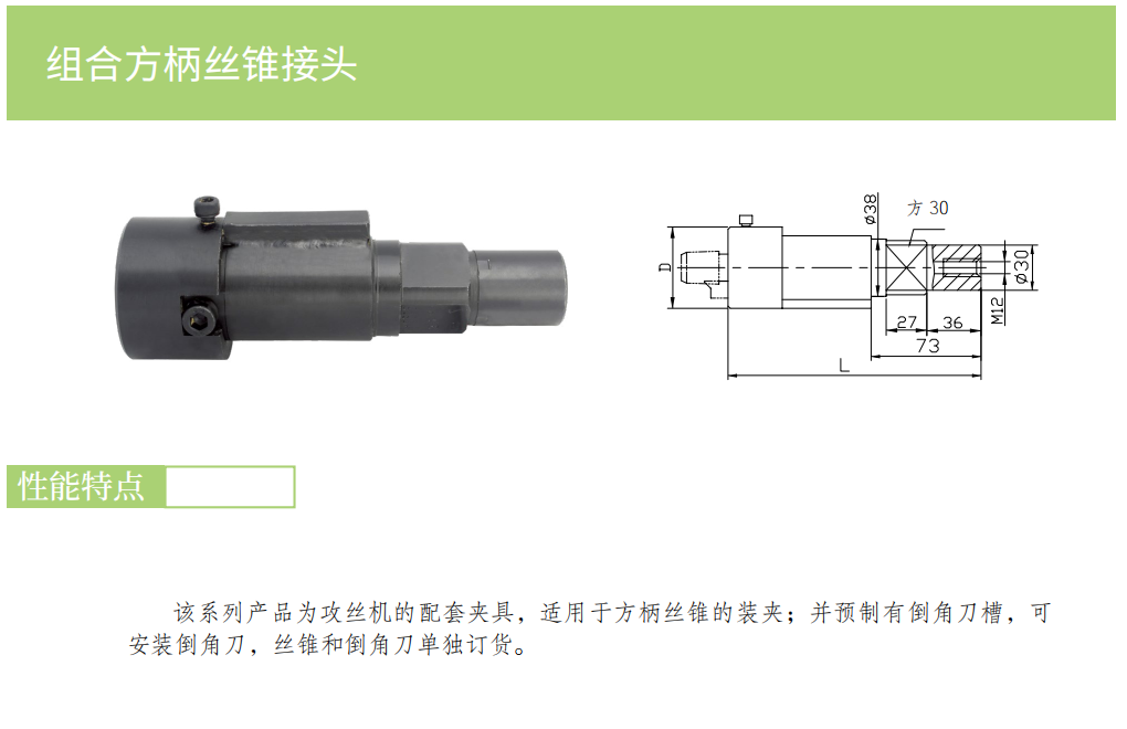 該系列產(chǎn)品為攻絲機的配套夾具,適用于方柄絲錐的裝夾,并預(yù)制有倒角刀槽,可安裝倒角刀,絲錐和倒角刀單獨訂貨。