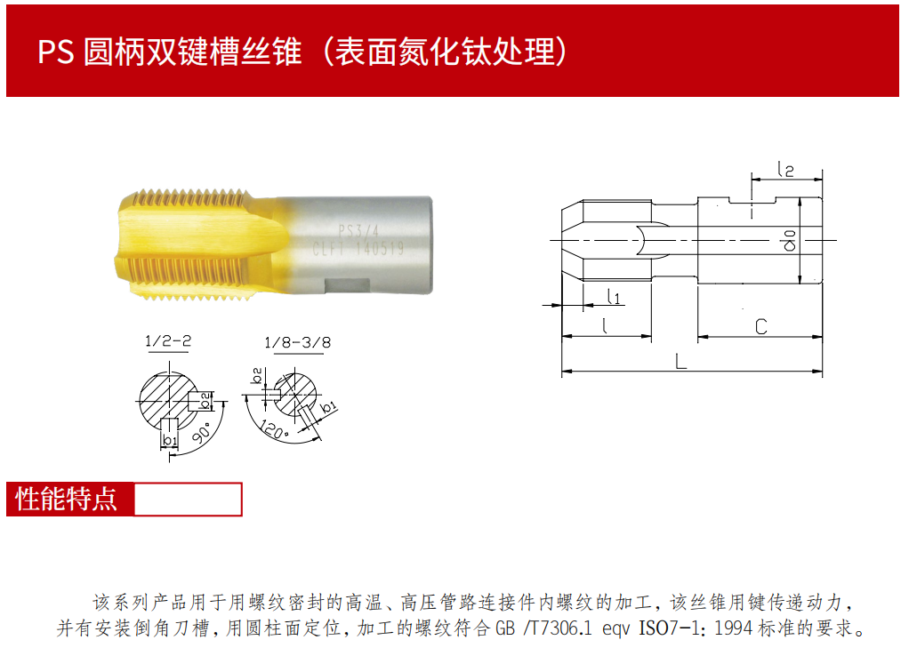 該系列產(chǎn)品用于用螺紋密封的高溫、高壓管路連接件內(nèi)螺紋的加工,該絲錐用鍵傳遞動(dòng)力,并有安裝倒角刀槽,用圓柱面定位,加工的螺紋符合GB/T7306.1 eqv ISO7-1:1994標(biāo)準(zhǔn)的要求。